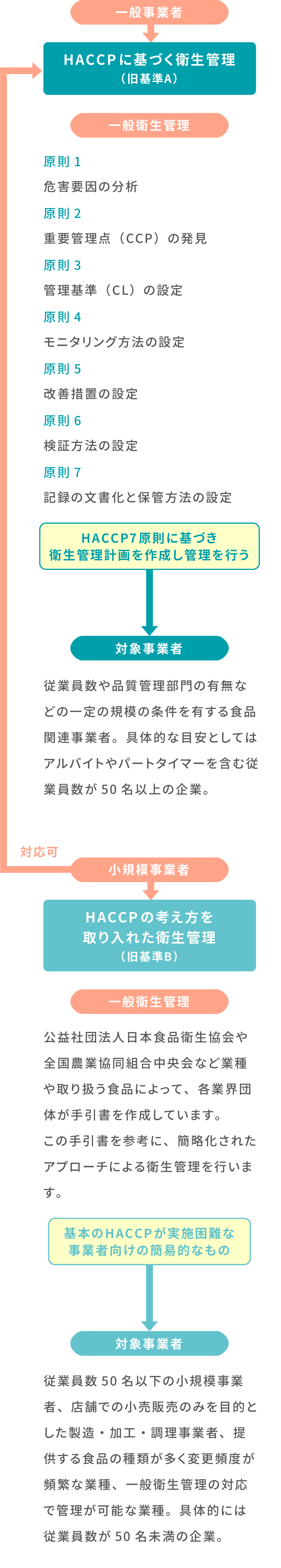 HACCPの対象となる業者は、フードチェーンを構成する食品の製造・加工、調理、販売などの食品を扱うすべての業者です。現在、食品衛生法では、営業するのに許可が必要な業種が34ありますが、HACCPは食品衛生法では許可が必要ないすべての業種も対象となります。ただ、小規模な飲食店などで、HACCPで求められる管理方法を実施することは大きな負担になる可能性があるため、「どこまで衛生管理に着手するか」ということを事業形態や規模ごとに「基準A(HACCPに基づく衛生管理)」と「基準B (HACCPの考え方を取り入れた衛生管理)」に分けています。基準A(HACCPに基づく衛生管理)は「コーデックス委員会の7原則12手順」によって導入されたHACCP方式による衛生管理を行うことを指します。一方の基準B(HACCPの考え方を取り入れた衛生管理)はHACCPの考え方に基づいて可能な範囲で衛生管理を行うことを指します。